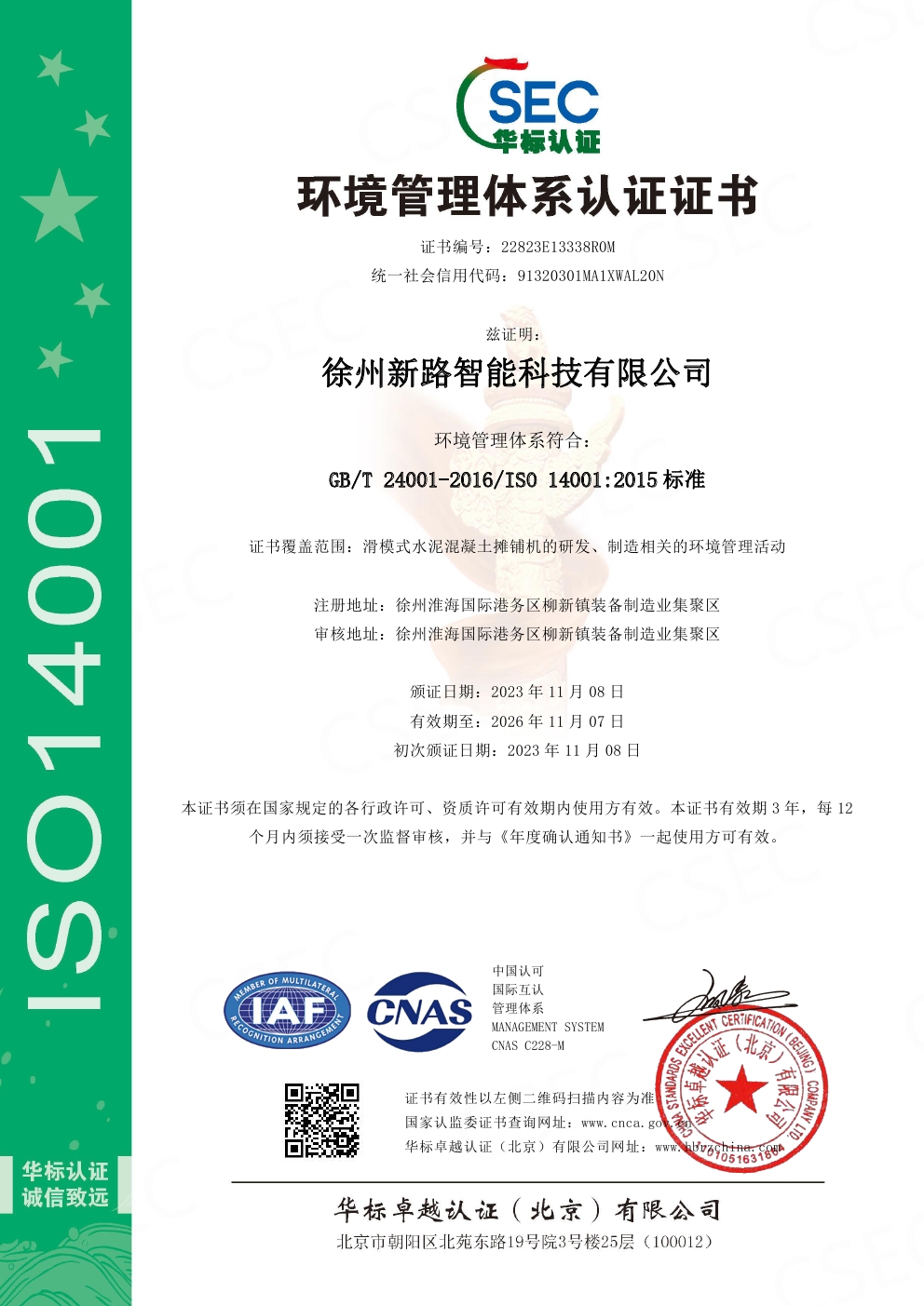 環境管理體系認證證書